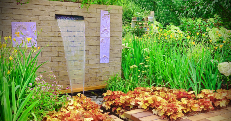 Vodní nádrž s průtokem přes dlážděnou terasu skýtá zajímavou podívanou už sama o sobě. Ale teprve osázení ji promění v zahradní skvost: linie dlažby půvabně doplňují přízemní dlužichy.
