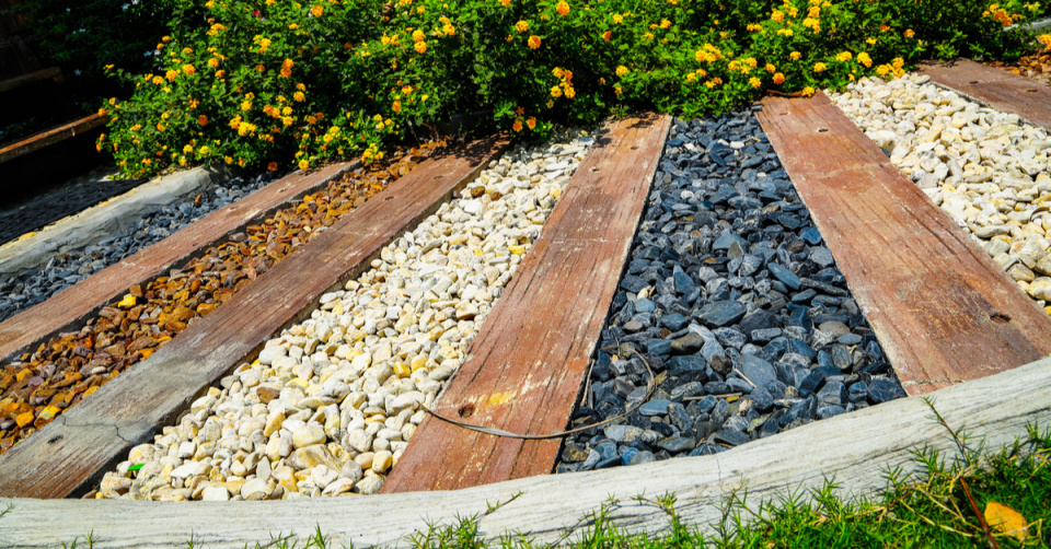 Čistě štěrková nebo drobnějšími kameny vysypaná a dřevem obložená zahradní cesta by působila nudně, kombinací materiálů ale vznikne atraktivní plocha. Teplé dřevo a chladný kámen můžete bez obav použít také na jiných místech v zahradě.