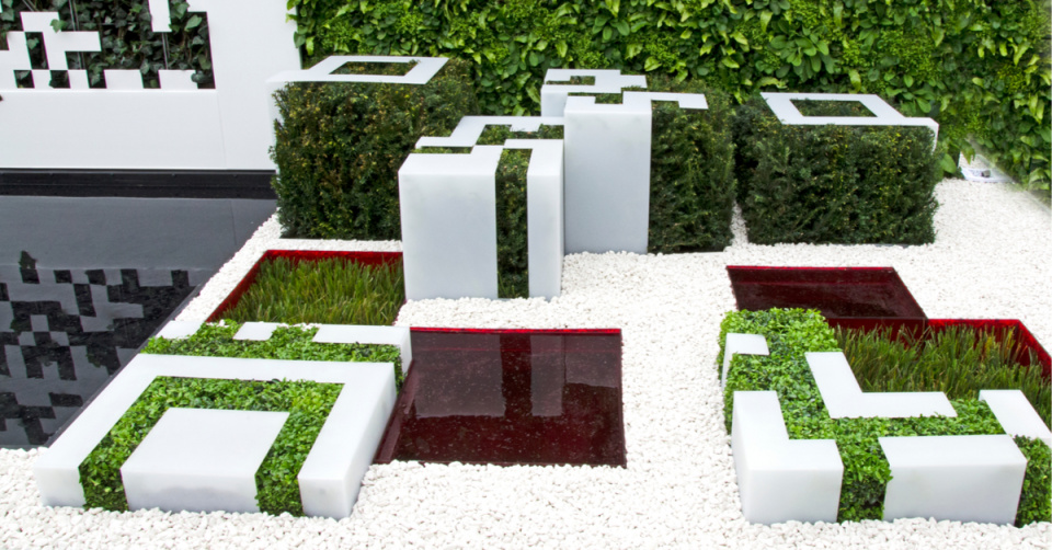 Tato zahrada v sobě skrývá hned několik protipólů: svěže zelené, ale do kvádru tvarované živé ploty, černou nádrž na vodu a bílé a strohé kameny. Ještě větší kontrast by do kompozice mohlo vnést rozvolněné přirozené osázení.