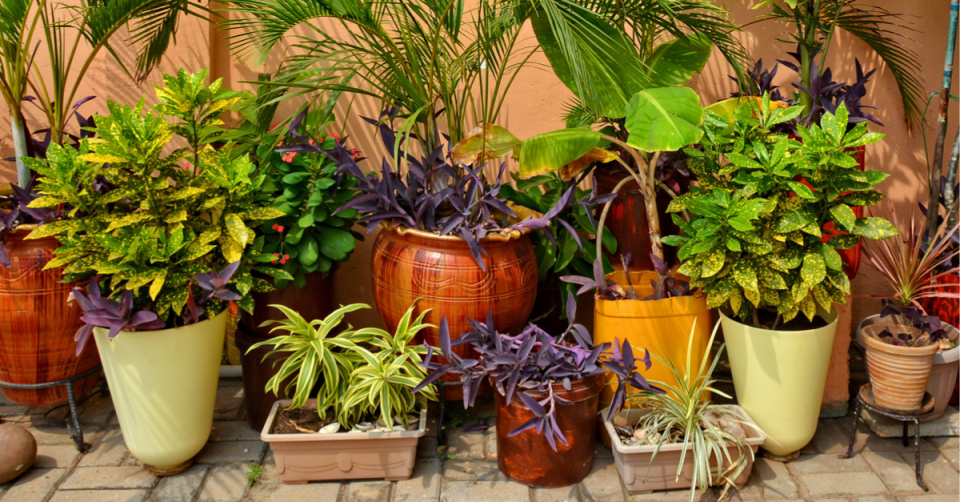 Velké květináče se dají zajímavě osázet, pokud použijete rostliny s nápadně odlišným tvarem a barvou listů a různým typem růstu. Celokrajné listy banánovníku kontrastují se složenými listy palem, kropenaté krotony s pruhovaným zelencem a kompozici letněných rostlin barevně oživuje fialový odstín voděnky.