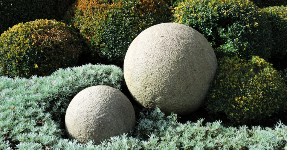 Ve skupině zimostrázových koulí bije do očí nápadná kamenná dekorace. Její tvar se přizpůsobil okolí, ale použitý materiál, barva a struktura poskytují protiváhu k dřevinám. Tohoto efektu docílíte i s využitím jiných dekorativních koulí.