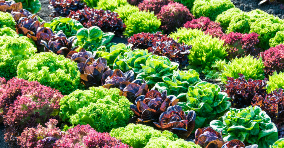 Záhon osázený světlými a tmavými saláty nenabízí jen chuťový, ale i vizuální požitek, zvláště když rostliny vysadíte v úhlopříčně probíhajících řadách jako zde. Zajímavá je i kombinace zkadeřených a hladkých listů.
