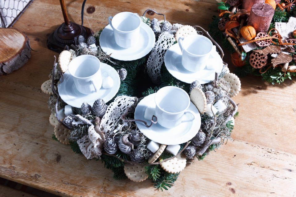 Pokud máte rádi originalitu, můžete jako držáčky na svíčky na adventním věnci využít kávové šálky.