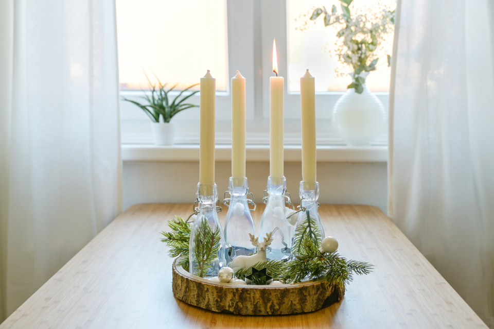 Křehkým dojmem bude působit adventní svícen vyrobený ze skleněných lahví. Ty postavte na masivní dřevo, dozdobte drobnou dekorací a máte vyhráno.