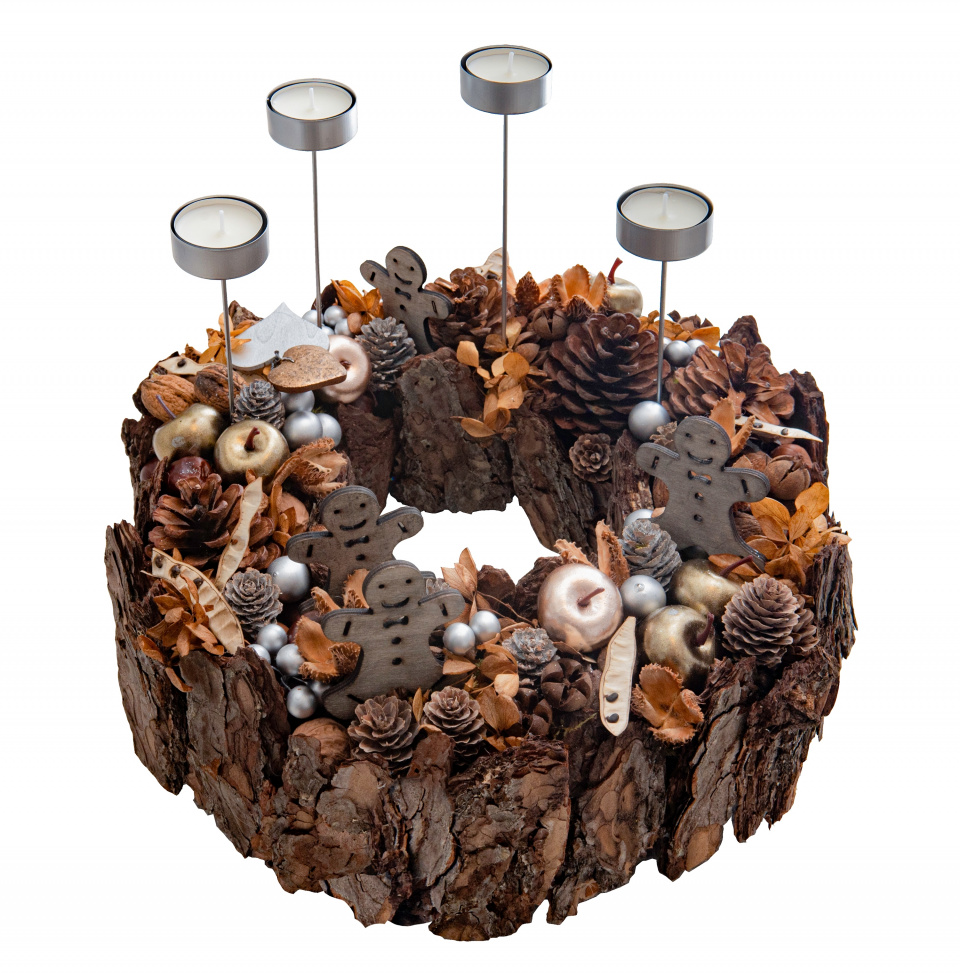Věnec jak z perníkové chaloupky. Zajímavým prvkem jsou svíčky umístěné na stopkách v různých výškách.
