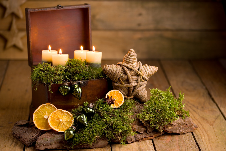 Temně zelená je hitem letošních Vánoc. Svíčky můžete umístit do dřevěné krabičky a lehce dozdobit zelení.