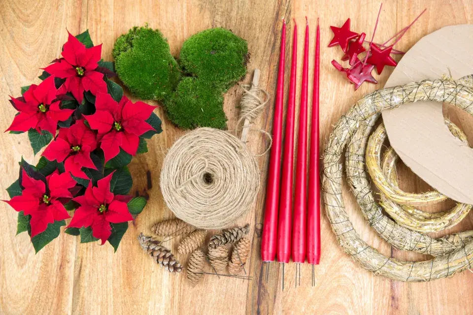 Na výrobu adventního věnce budete potřebovat 2 větší a 3 menší slaměné korpusy na věnce, pokud však seženete korpusy o větší síle, pak bude stačit jen jeden velký a jeden menší. Dále si připravte provázek, mikro folii, papírový karton, zeminu, 6 červených mini poinsettií, pevný drát, červené hvězdy ze dřeva, smrkové šišky, mech, 4 červené štíhlé a vysoké svíčky, tavnou pistoli