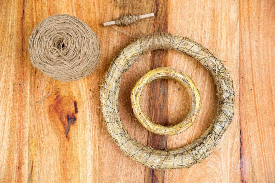 Použijte slaměné korpusy na věnce, ale klidně i korpusy z polystyrenu, které jsou levnější a prodávají se v různých rozměrech. Jeden velký korpus postavte na druhý a slepte je k sobě tavnou pistolí. Stejným způsobem postupujte i se třemi malými korpusy. Dva stejně vysoké korpusy, které jste takto vytvořili nebo rovnou dva silnější korpusy na věnce omotejte přírodním provázkem, může to být například sisalový nebo lněný provázek