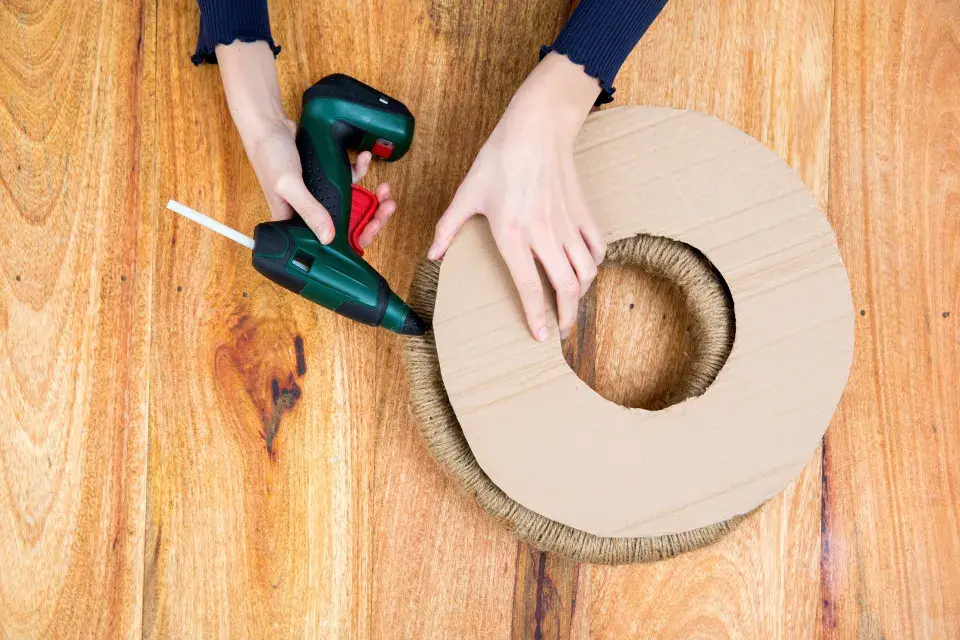 Malý věnec vložte doprostřed velkého věnce a z tvrdého kartonu vystřihněte kruhovou základnu odpovídající velikosti velkého věnce. Pomocí tavné pistole přilepte vystřižený kruh k věncům