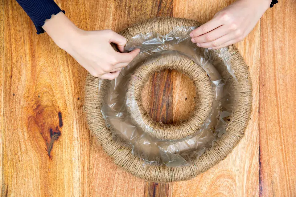 Prostor mezi věnci pečlivě vyložte nepropustnou folií. A váš adventní věnec je připraven k osázení je připraven k osázení