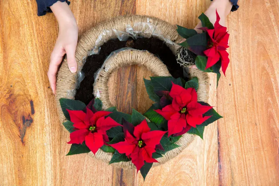 Vyplňte vnitřní prostor zeminou, poinsettie vyjměte z původních obalů a pravidelně je rozmístěte do vzniklého slaměného květináče. Doplňte zeminou a zakryjte mechem