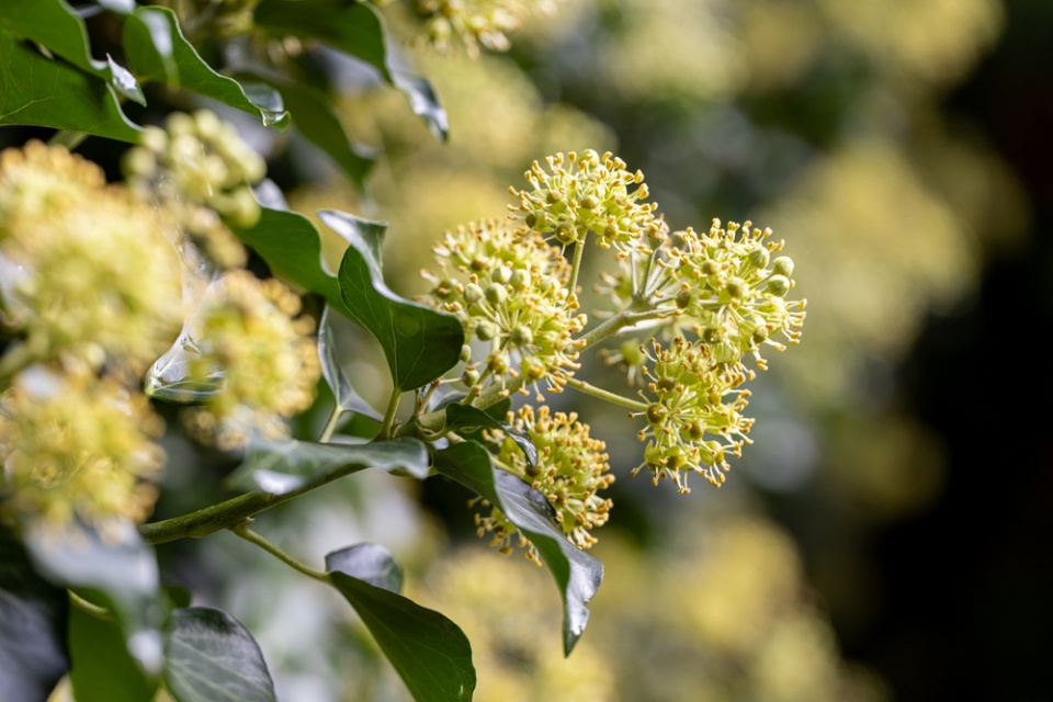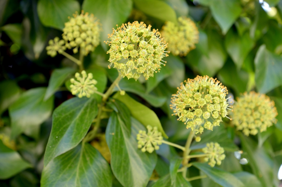 Kulovité květenství břečťanu, plné pylu i nektaru