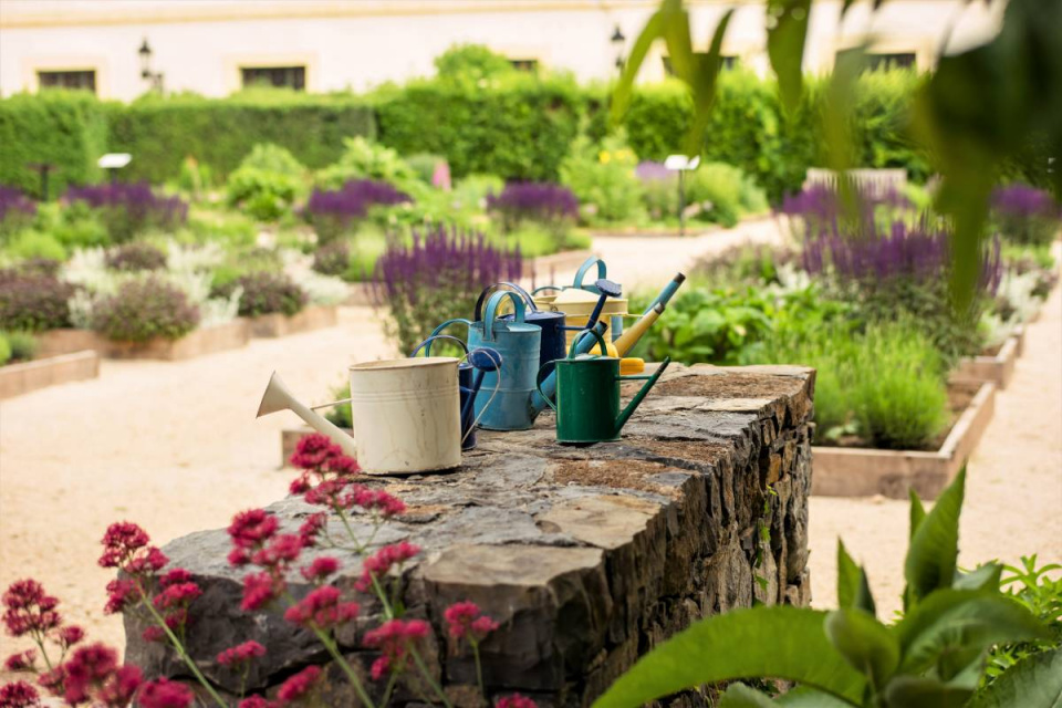 Rodinám s dětmi je k dispozici posezení s pískovištěm ve stinné části zahrady a vodní prvek s konvičkami na zalévání rostlin.