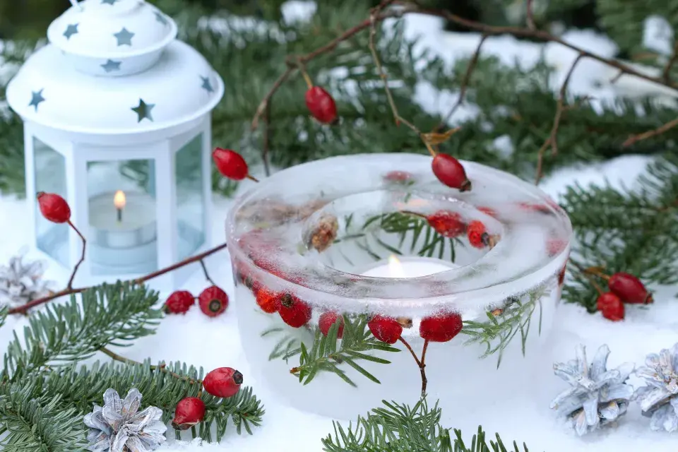 Při mrazivém počasí můžete zkusit vytvořit svícny z ledu. Vložte do sebe dvě různě velké nádoby, tu vnitřní zatižte a do meziprostoru mezi nimi nalijte vodu a ponořte třeba červené šípky. Po zmrznutí přelijte zvnějšku větší nádobu horkou vodou, vnitřní led uvolněte a do prostoru uprostřed dejte svíčku.