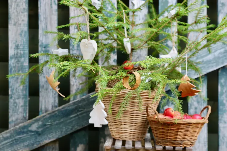 Živý vánoční stromeček je základ. Pěkně bude vypadat v proutěném koši, který ale předem vystelte igelitem, abyste zálivkovou vodou košík zbytečně neponičili.