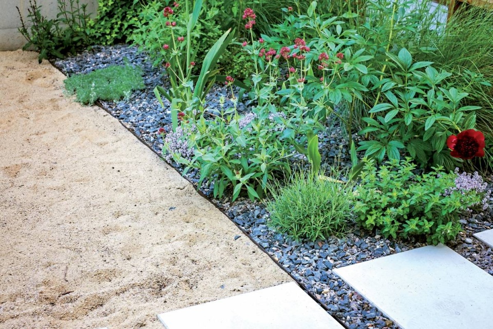 Štěrkovým záhonům osázeným suchomilnými rostlinami stačí závlaha dvakrát do měsíce.