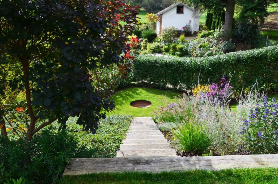 Využito bylo také stávající dřevěné schodiště krásně prorostlé skalníkem, které vede k nově umístěnému prvku – kovovému zapuštěnému ohništi z Vítkovic.