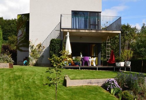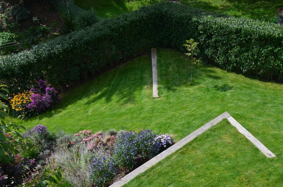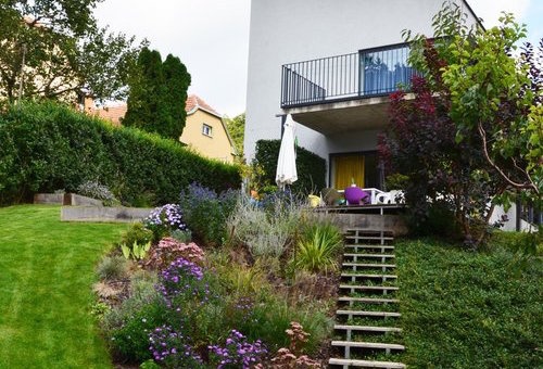 Ta byla vyřešena pomocí modelace malých travnatých terásek s dubovými trámy, které zároveň vytvářejí malou svahovou opěrku. „Na vzniklých rovinkách je teď možné postavit lavici nebo poležet na dece bez pocitu, že se člověk skutálí dolů. Trámy nejenom že jsou velmi funkční, ale také výtvarně akcentují trávník. Samozřejmě se na nich dá i sedět a jen tak koukat do zahrady,” popisuje architekt.