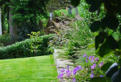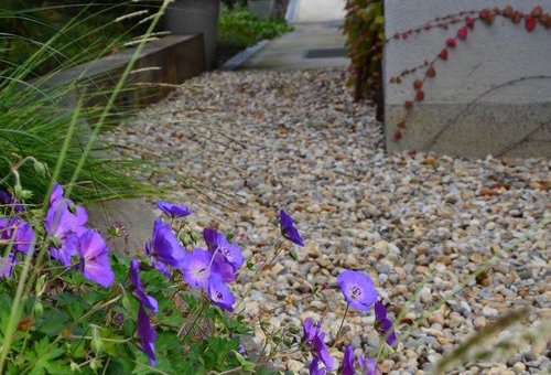 Zbývající keřové solitéry byly doplněny trvalkami převládající modrofialové barvy.
