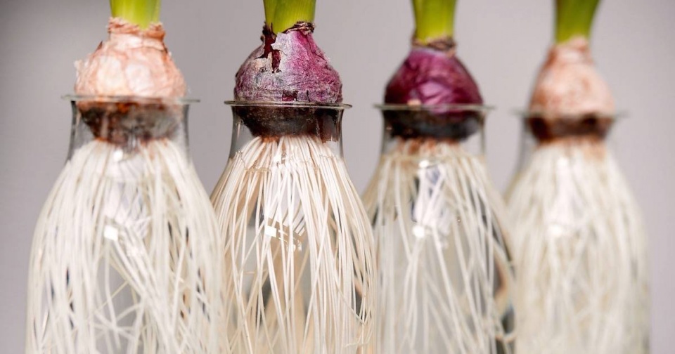 K rychlení cibulí jsou ideální nakličovací vázy. Snadno je ale nahradíte obyčejnými vázami, do nichž zastrčíte ustřižené horní části plastnových lahví.