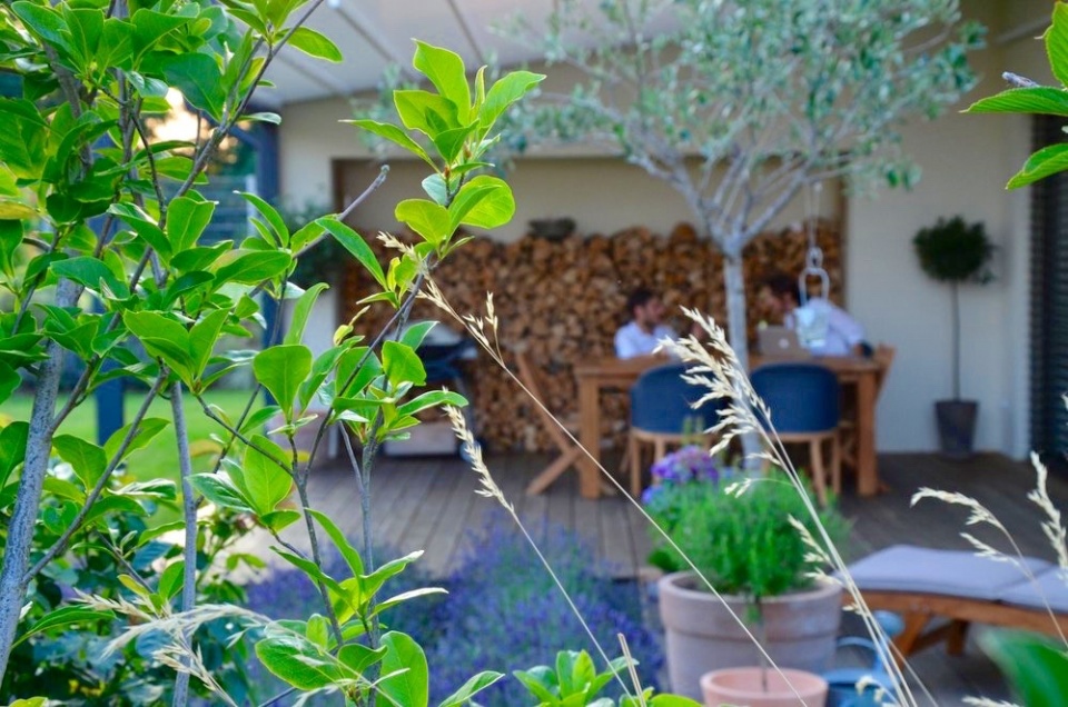 Nádoby s rostlinstvem se přelévají i na hlavní pobytovou terasu, která je zabydlena olivovníky a dalším rostlinstvem – bylinky se tu mísí s letničkami a okrasnými keři.