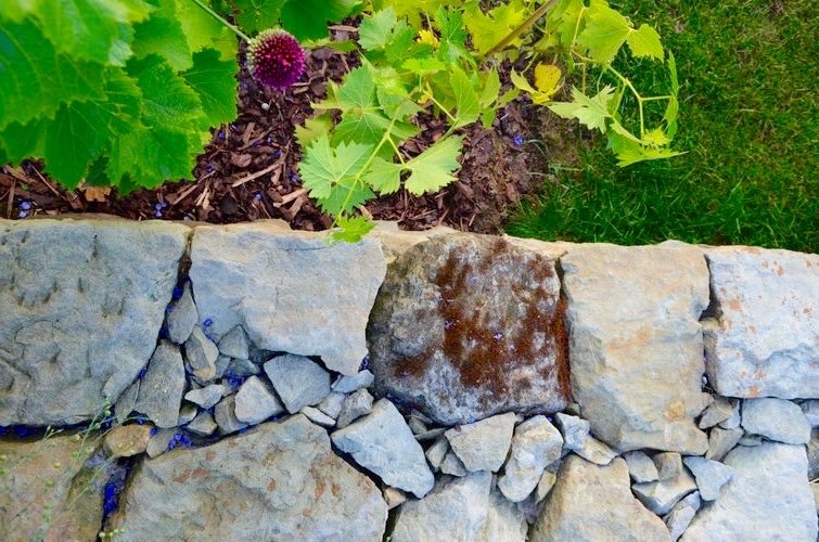 „Všechen ten lehký pohyb a jemné tvary jsou pak akcentovány kamennými zídkami, které měly být v původní verzi z vrstveného, probarvovaného betonu v teplých tónech, nakonec jsme ale zvolili tradičnější materiál – skládané kamenné zdi,” popisuje Jakub Finger.