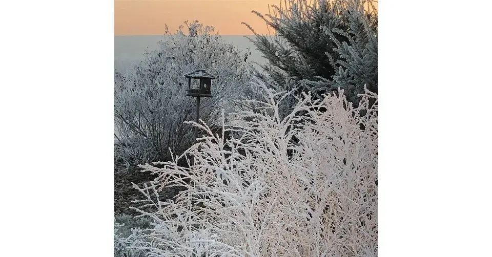 „Posílám fotografii ze zahrady nazvanou „Jinovatka za svítání". Fotila jsem ji za lednového rozbřesku, když jsem cestičkou v trvalkovém záhonu nesla slunečnicová semínka sýkorkám," popisuje paní Jana.