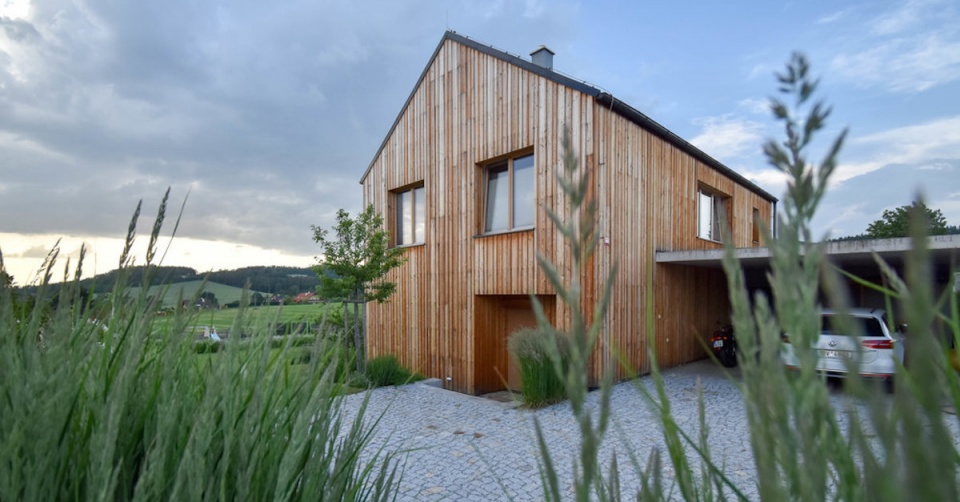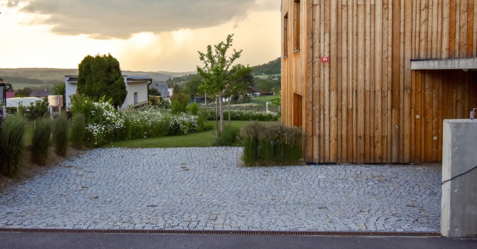 … opět v jednoduše pojatém vjezdu, dlážděném žulovou kostkou. Fasáda domu časem zajde ještě sytějším odstínem šedé a dům definitivně splyne se svým okolím.