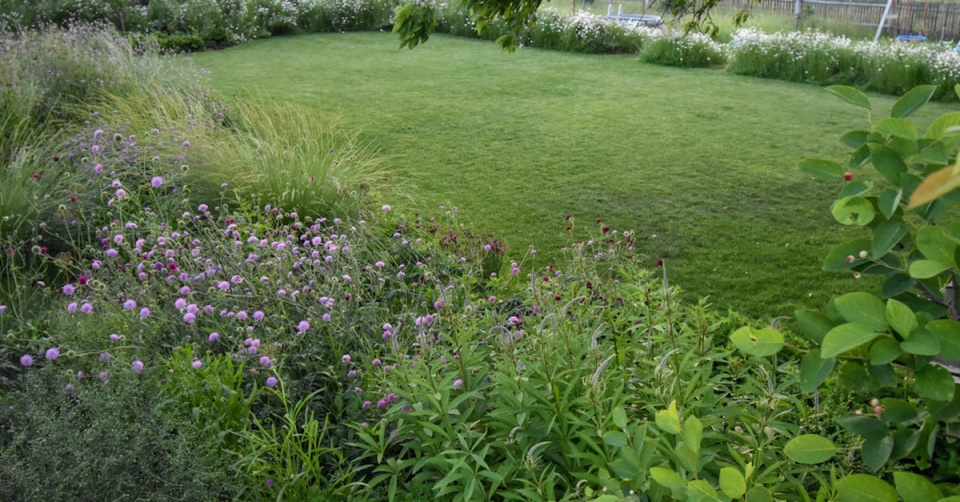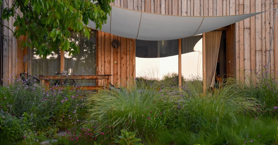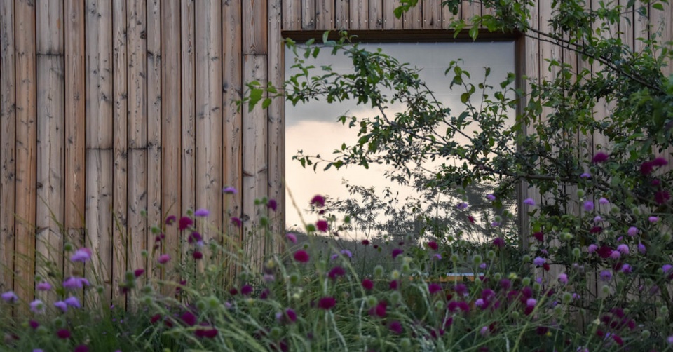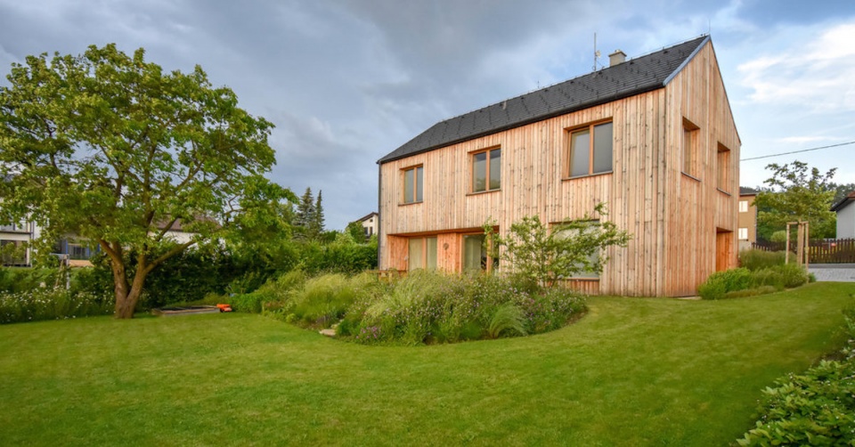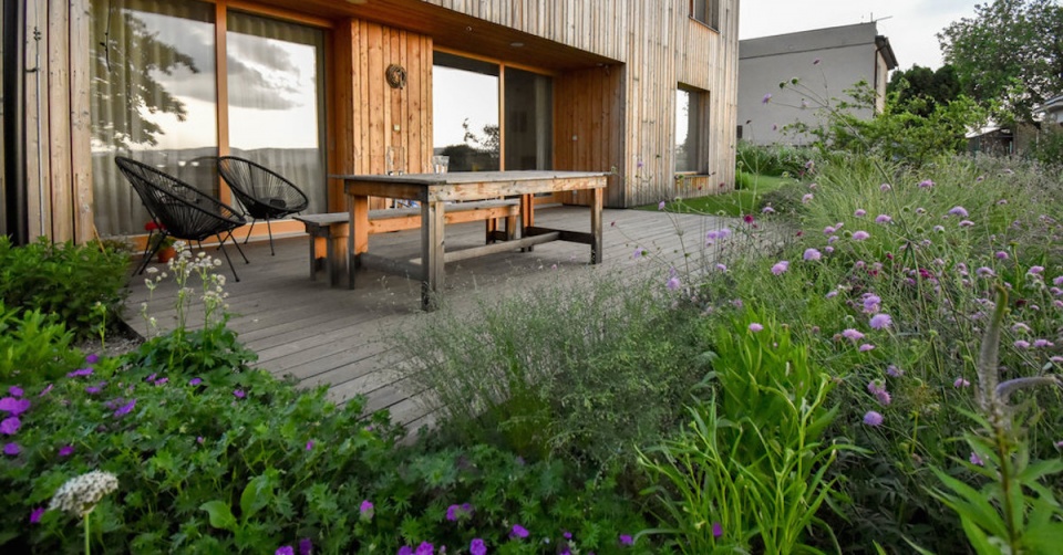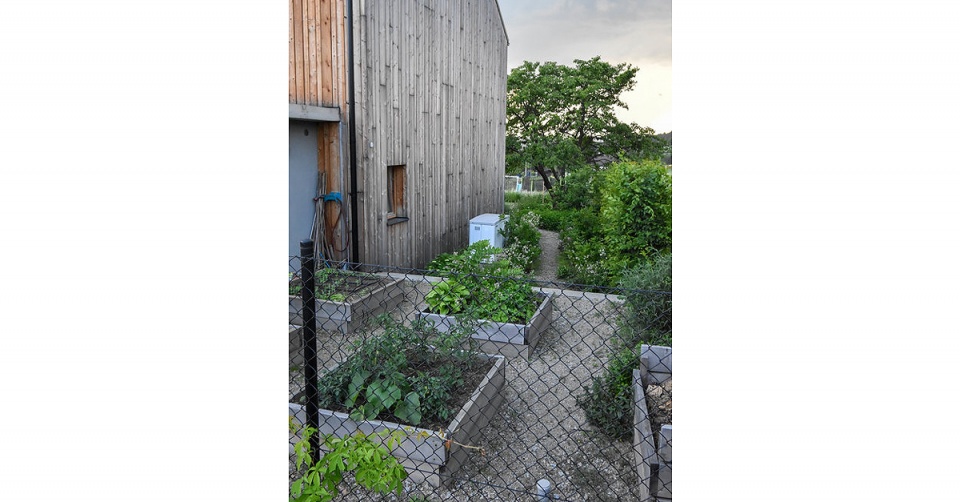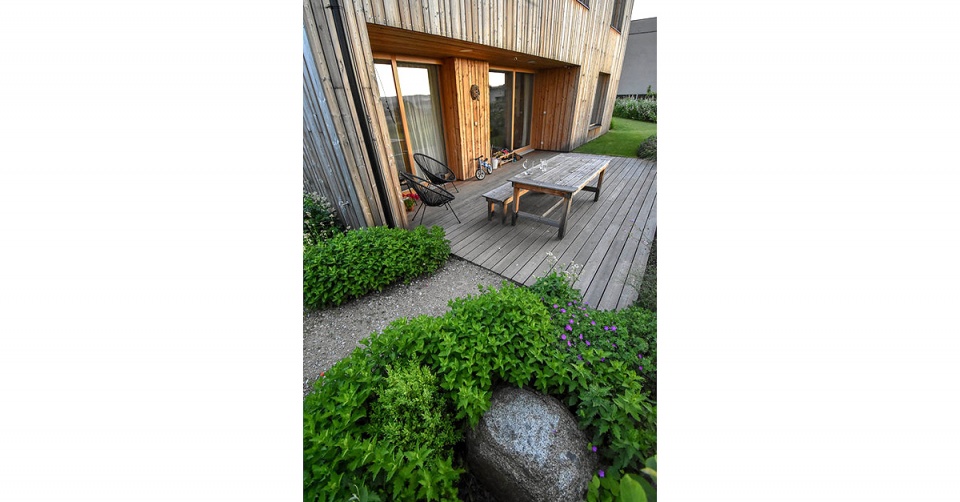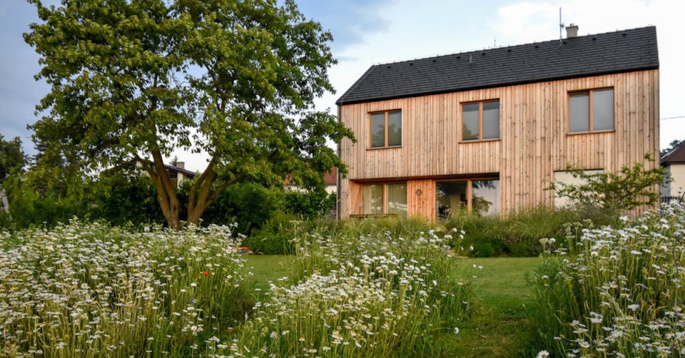 V louce jsou potom vysazeny ovocné stromy a divoké růže a skrývá také vyvýšené záhony s jahodami. Sad v louce jednou vyroste a svou hmotou nahradí starou třešeň, která je teď na pozemku dominantním stromem.
