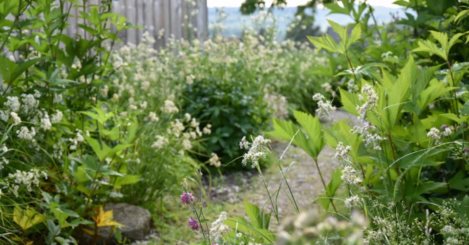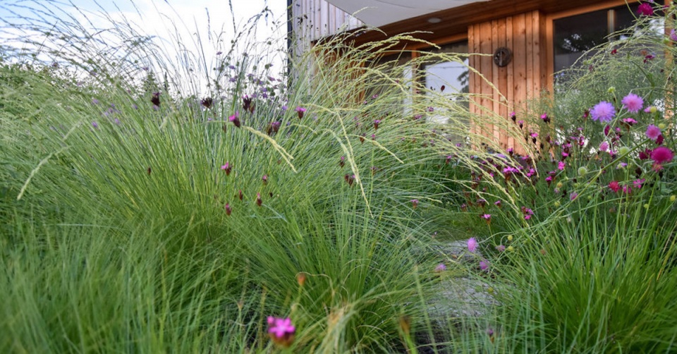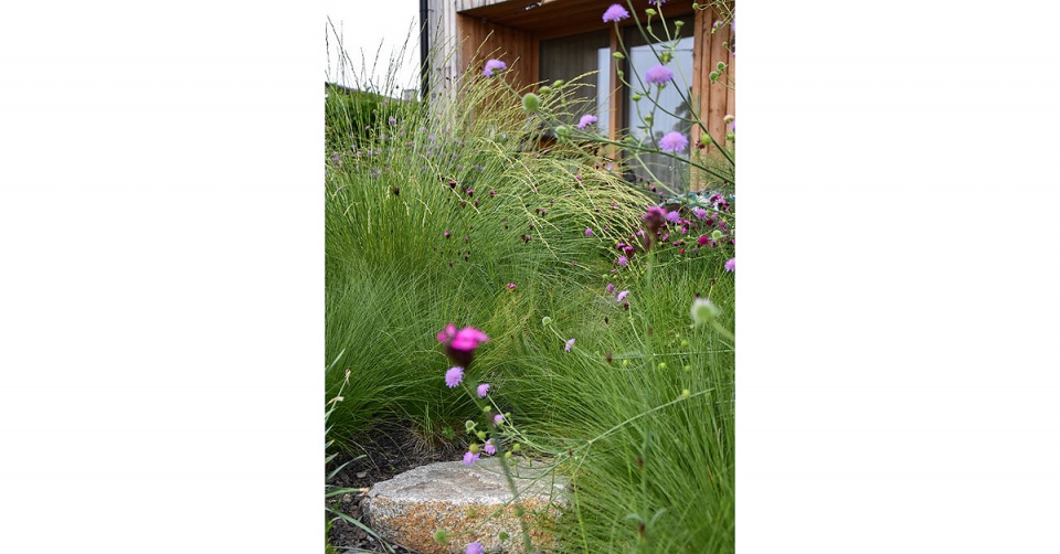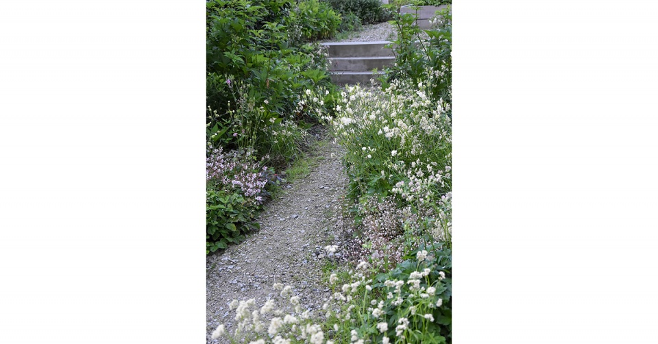 Mlatovou cestu lemují trvalky. Je tu prostor pro druhy toulavého stínu a divoké kvítí tu má krásné pozadí z přírodního dřeva.