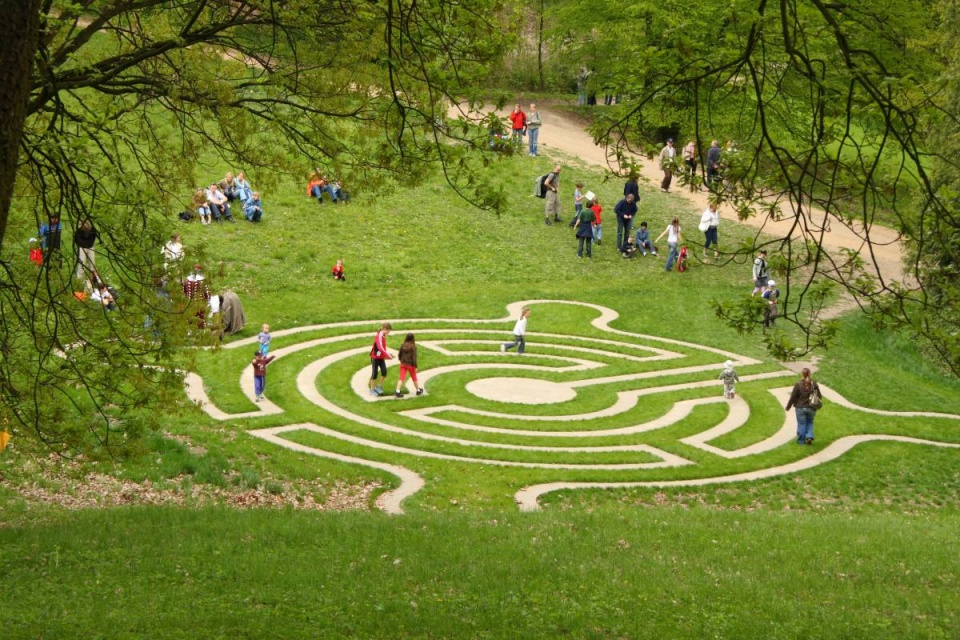Travnatý labyrint představuje křesťanský pohled na život člověka – vstup symbolizuje narození, cesta život a střed Boha – a je umístěn přímo proti dveřím do kostela.