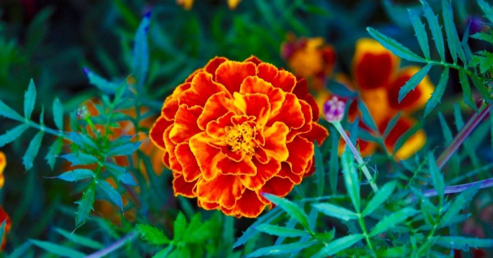 Aksamitník rozkladitý (Tagetes patula) je 30 cm vysoká letnička s květy různých tvarů a barev. Základní barvou je teple žlutá nebo oranžová, květy se ale často vyznačují i červenými znaky. Rostlina je maximálně spolehlivá a je o ní známo, že v půdě blokuje vývoj parazitických háďátek.