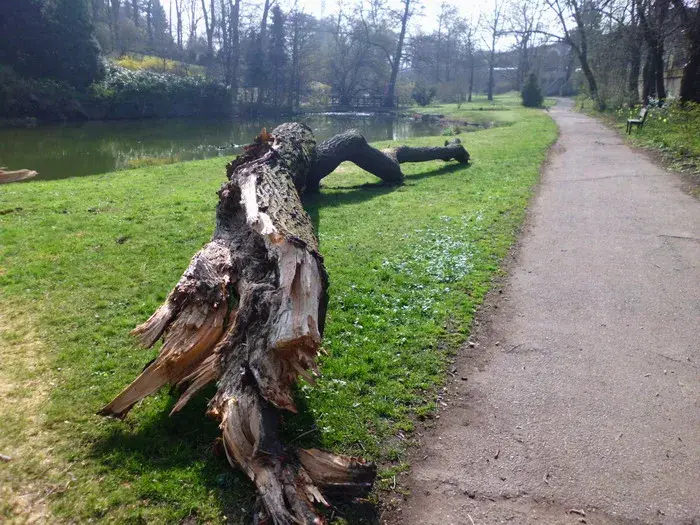 Kmen vyvráceného stromu funguje na břehu rybníka jako lavička i atraktivní prvek zároveň.