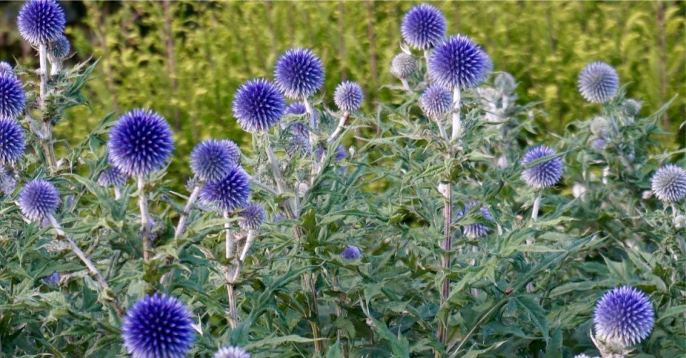 Do jednobarevné výsadby vnesete napětí použitím rostlin s výrazně odlišnými tvary květů. Na slunném a sušším záhonu tak vynikne bělotrn modrý (Echinops ritro ’Veitch’s Blue’).