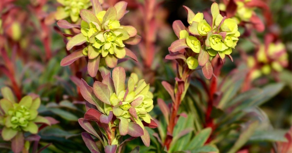 Vínové zbarvení pryšce mandloňovitého (Euphorbiaa amygdaloides) ’Purpurea’ je výraznější s vyšším množstvím dusíku v půdě.