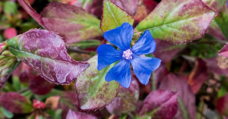 Listy kobercovitě rostoucího rohovce olověncovitého (Ceratostigma plumbaginoides) se koncem léta barví do tmavě červené, k tomu má modré květy.