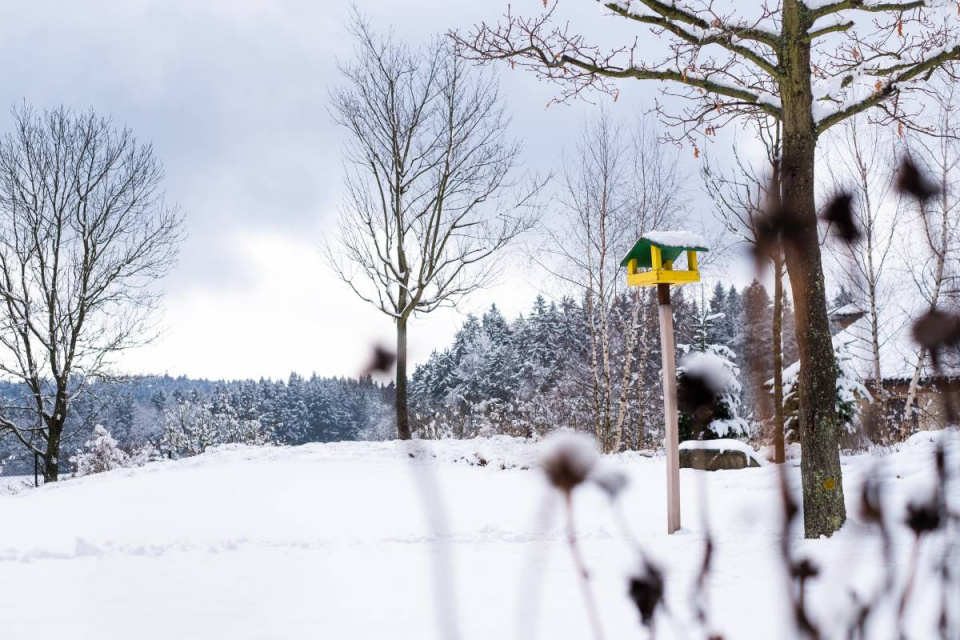 Na zahradě nechybí ani krmítko pro přezimující ptáky a oči těch, kdo tu bydlí.