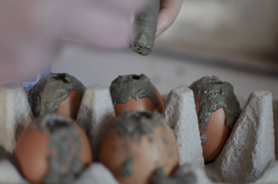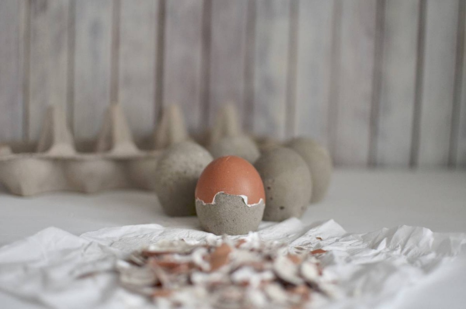 Nejdříve vyfoukněte vajíčka a vymyjte je. Následně do připravené nádoby nasypte beton a přidejte vodu. Konzistence betonu by měla odpovídat hustší bramborové kaši – beton by měl držet tvar, ale když s ním trochu zaklepete, měl by se pomalu roztékat do stran.