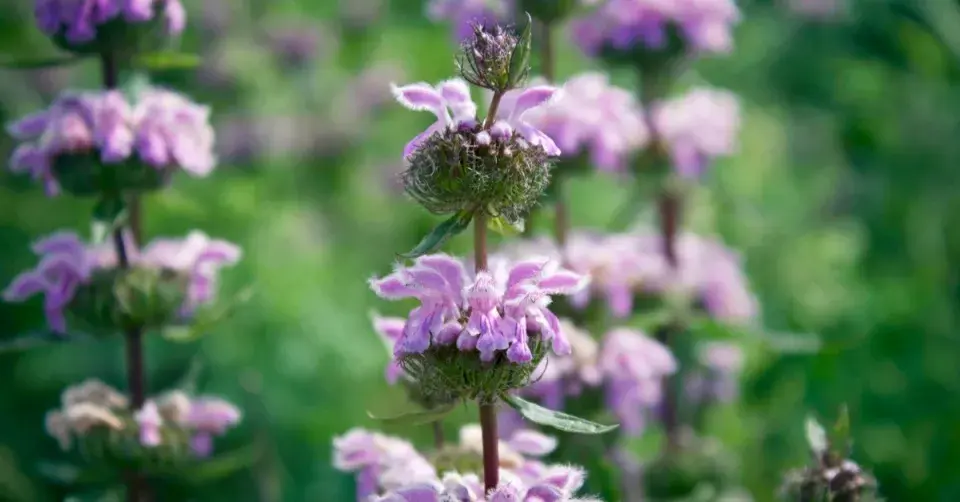 Sápa hlíznatá (Phlomis tuberosa) je vysoká 60–80 cm a kvete růžově.