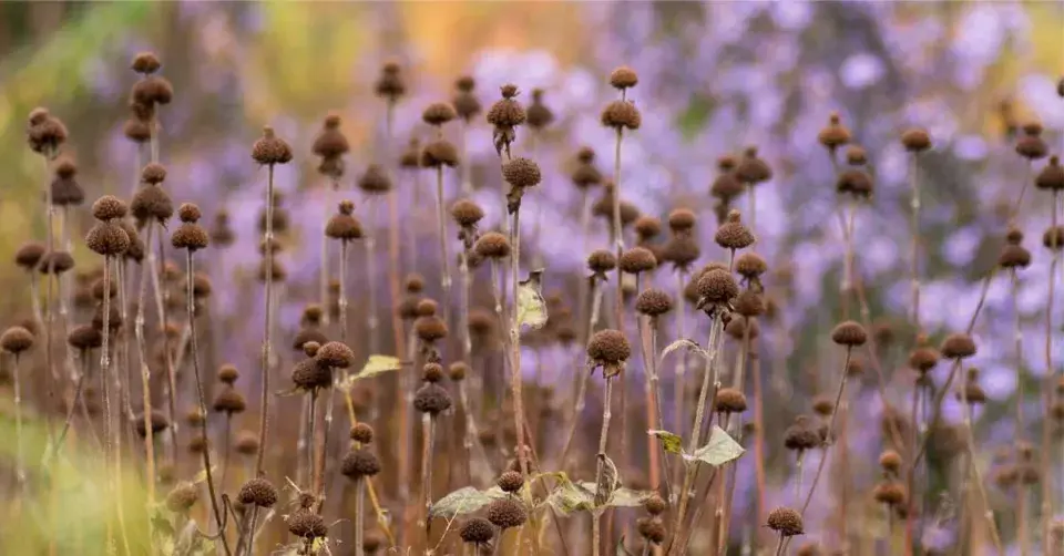 Kulovitá plodenství sápy pěkně kontrastují s jinými rostlinami.