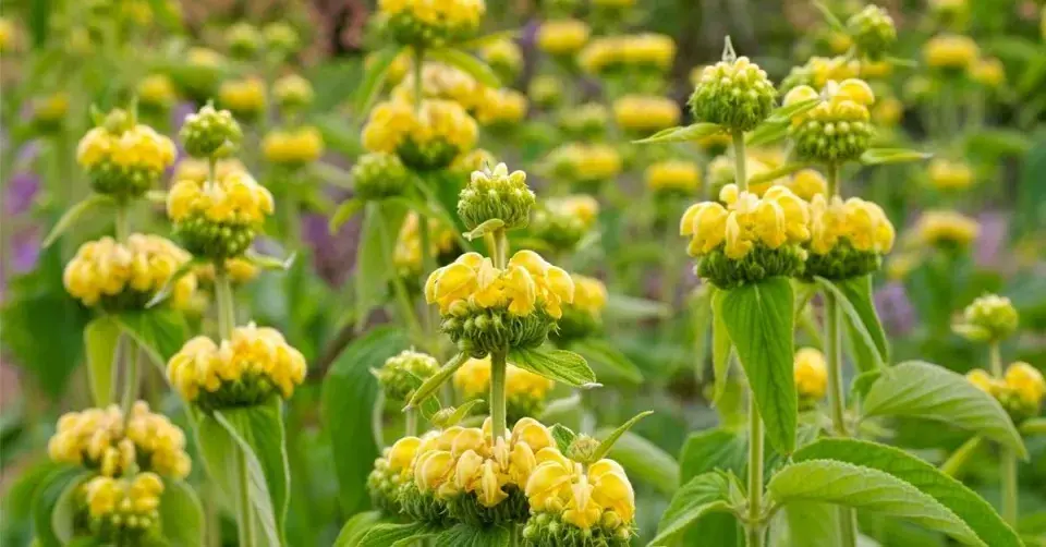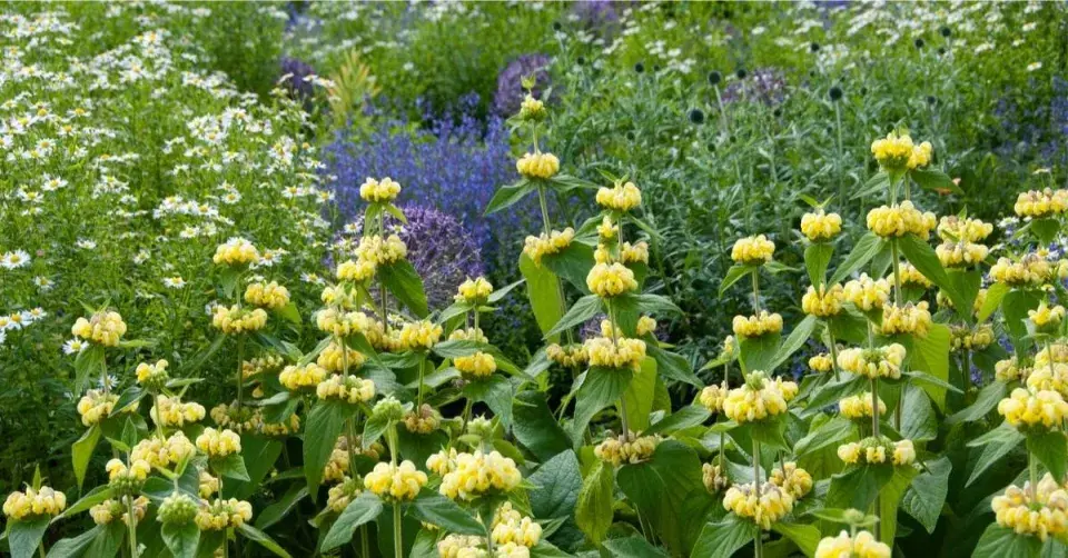 Pokud sápu Russelovu (Phlomis russeliana) zasadíte vedle druhů, které kvetou v komplementárních modrých a fialových barvách, bude záhon působit harmonicky.