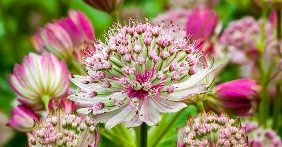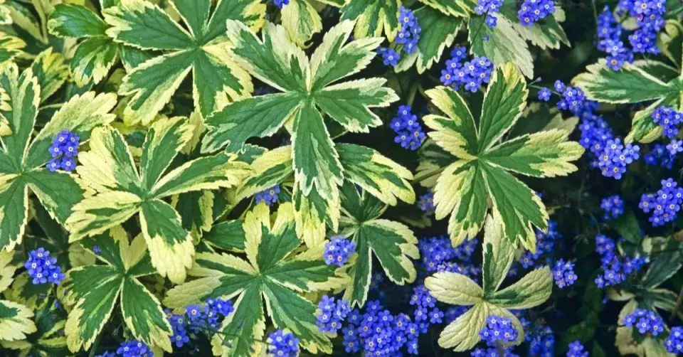 Kultivar jarmanky 'Sunningdale Variegated' se vyznačuje panašovanými listy a bílými až růžovými květy.