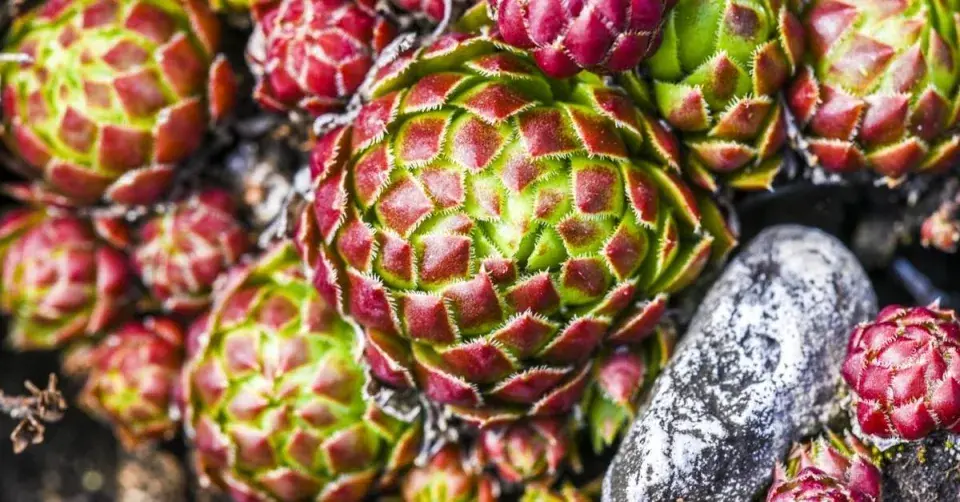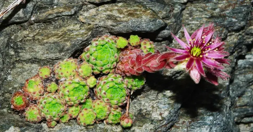 Netřesk horský (Sempervivum montanum) vytváří květy růžové barvy.