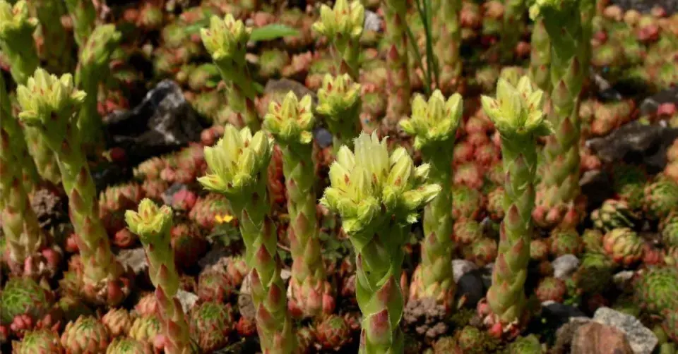 Netřeskovec výběžkatý (Jovibarba globifera) kvete žlutými květy.