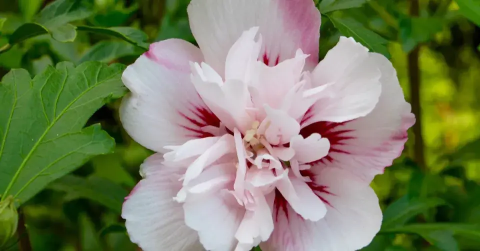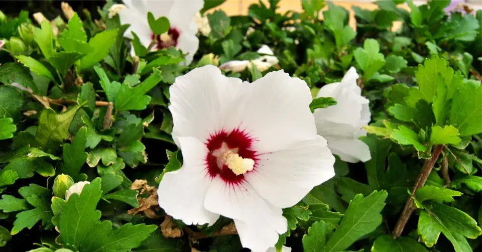 Ibišek syrský (Hibiscus syriacus) 'Red Heart' kvete bílým květy s červeným středem, z něhož vybíhají drobné červené žilky.
