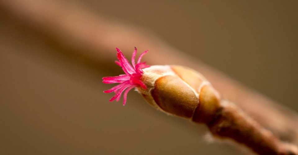 Samičí pupenovité květy lísky jsou v porovnání s jehnědami nenápadné a tvoří je karmínově červené blizny.