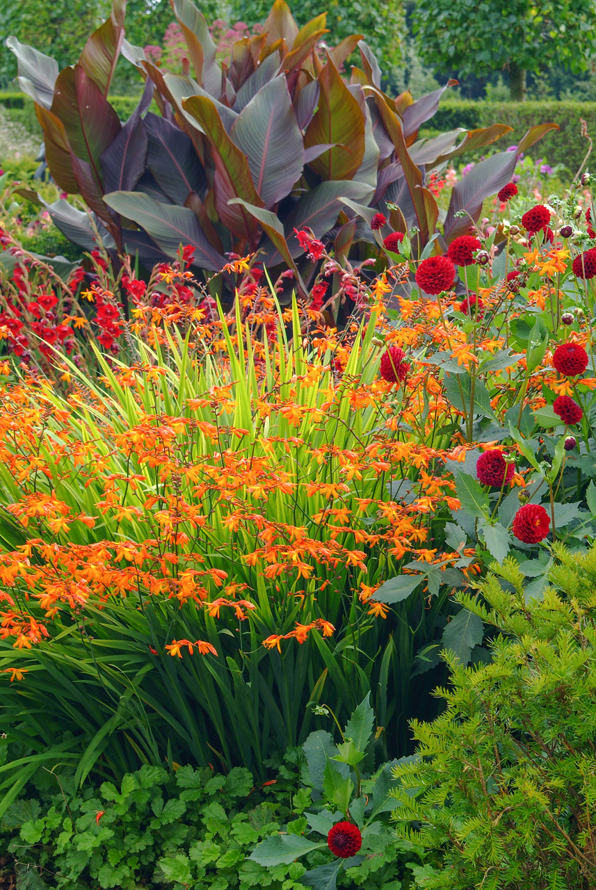 Temné listy dosen, červené květy jiřinek a mečíků a oranžové montbrécie (na fotce odrůda 'Rheingold'): dokonalá souhra tvarů a barev.
