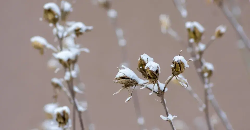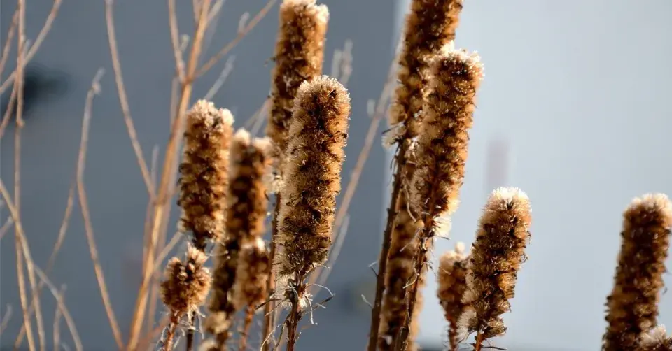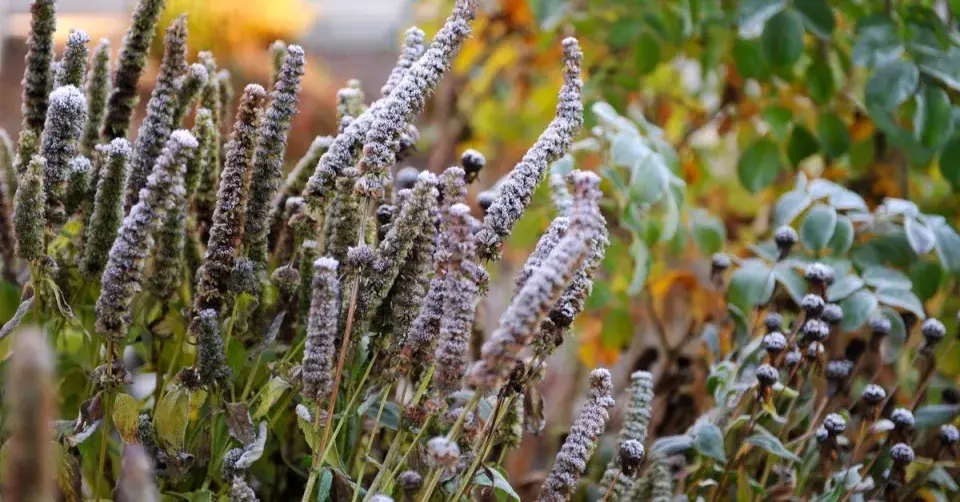 Agastache (Agastache) pokrývají v mrazivém dnu ledové krystalky. Tato trvalka nadchne dlouhým letním kvetením a aromatickými listy.