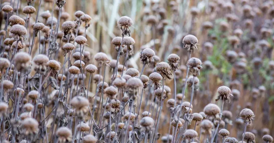 Kulovitá plodenství zavinutky (Monarda) ozdobí záhon až do jara (kdy je načase lodyhy seříznout).