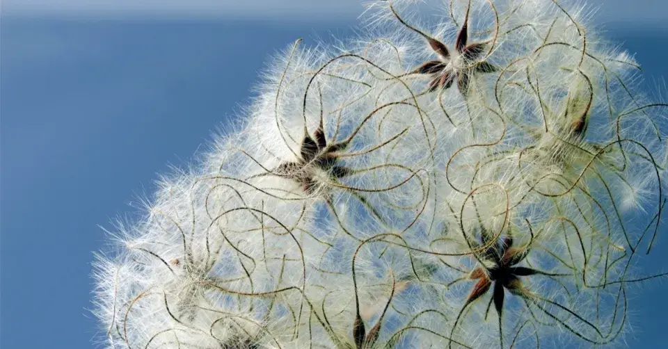 Plodenství plaménku plotního (Clematis vitalba), která v chomáčích zdobí dlouhé výhony, jsou za mrazu pokryta jemnými ledovými krystaly a vypadají kouzelně.
